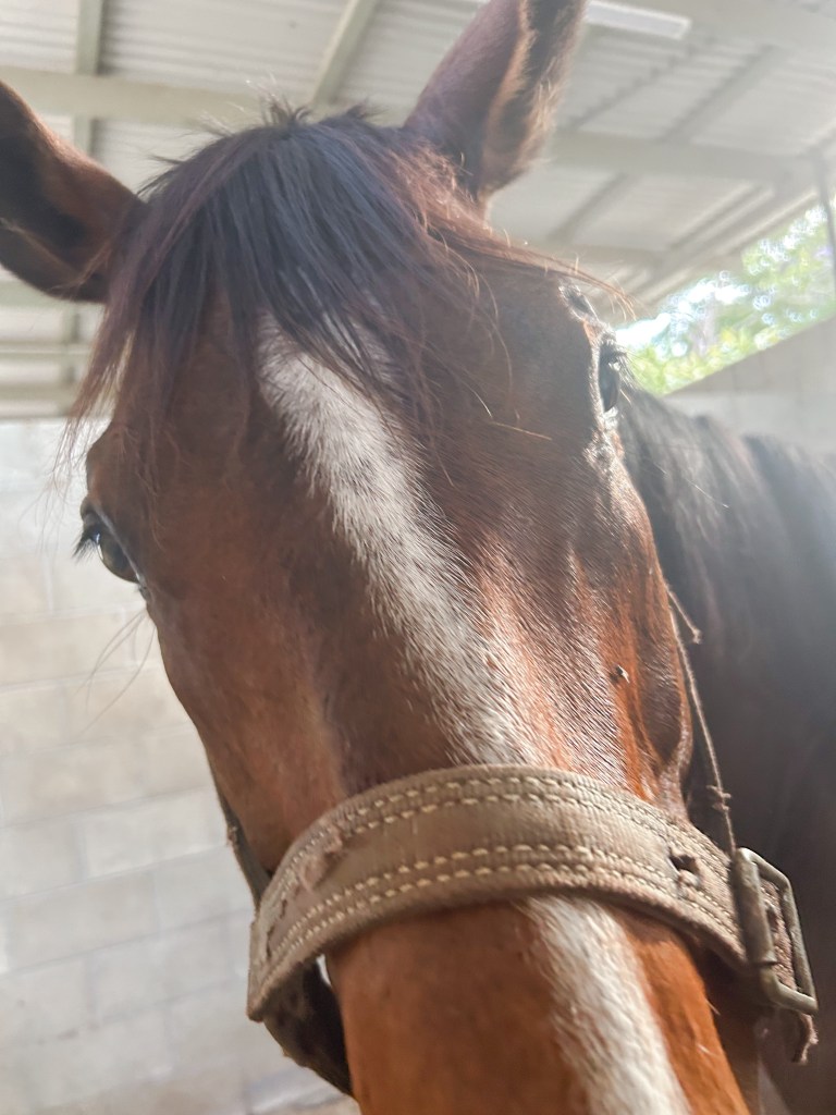 Since I bought Harry, he has had a bit of a runny eye. His old owner brushed it off as a bit of conjunctivitis and so I spent time cleaning it and it improved. However, around a week and a half ago, Harry’s eye was swollen, even more runny, red and half closed. The vet said his pupil was also very small and the sunlight was affecting it. He gave me some ointment to take the itch out and recommended that we organised an appointment with the eye specialist at the Equine Hospital. I followed the advice and on 19/10/23 Harry went in for his appointment. I was so nervous for it because the last horse we had who went in for similar issues was diagnosed with Uveitis and ended up having to be put to sleep for bilateral blindness and severe pain. I worried for Harry’s fate. What if he had to be put down? What if he was going to go blind?